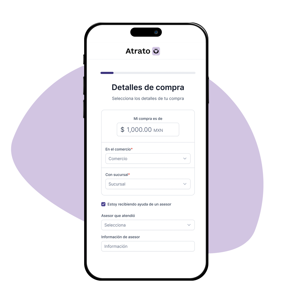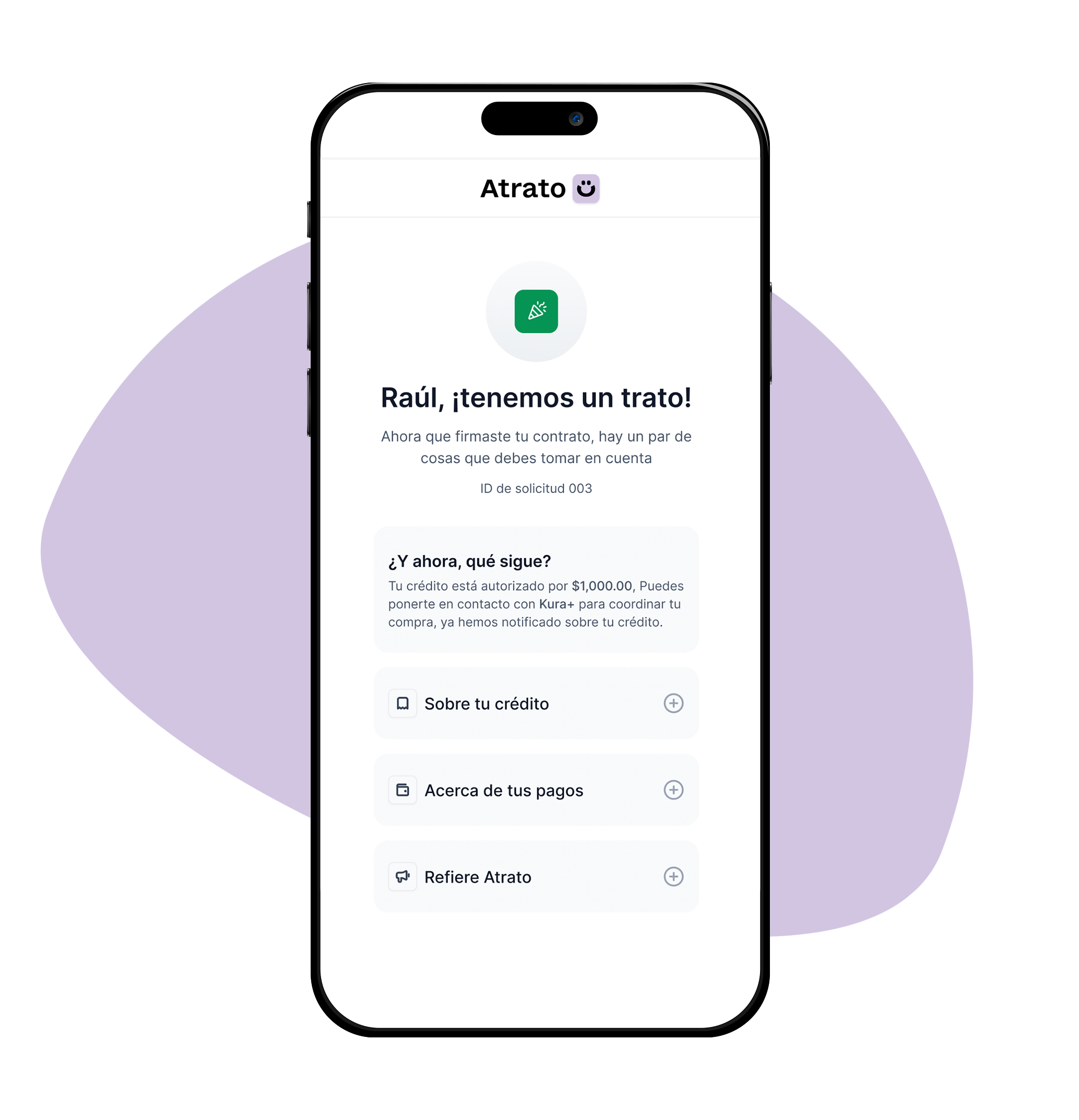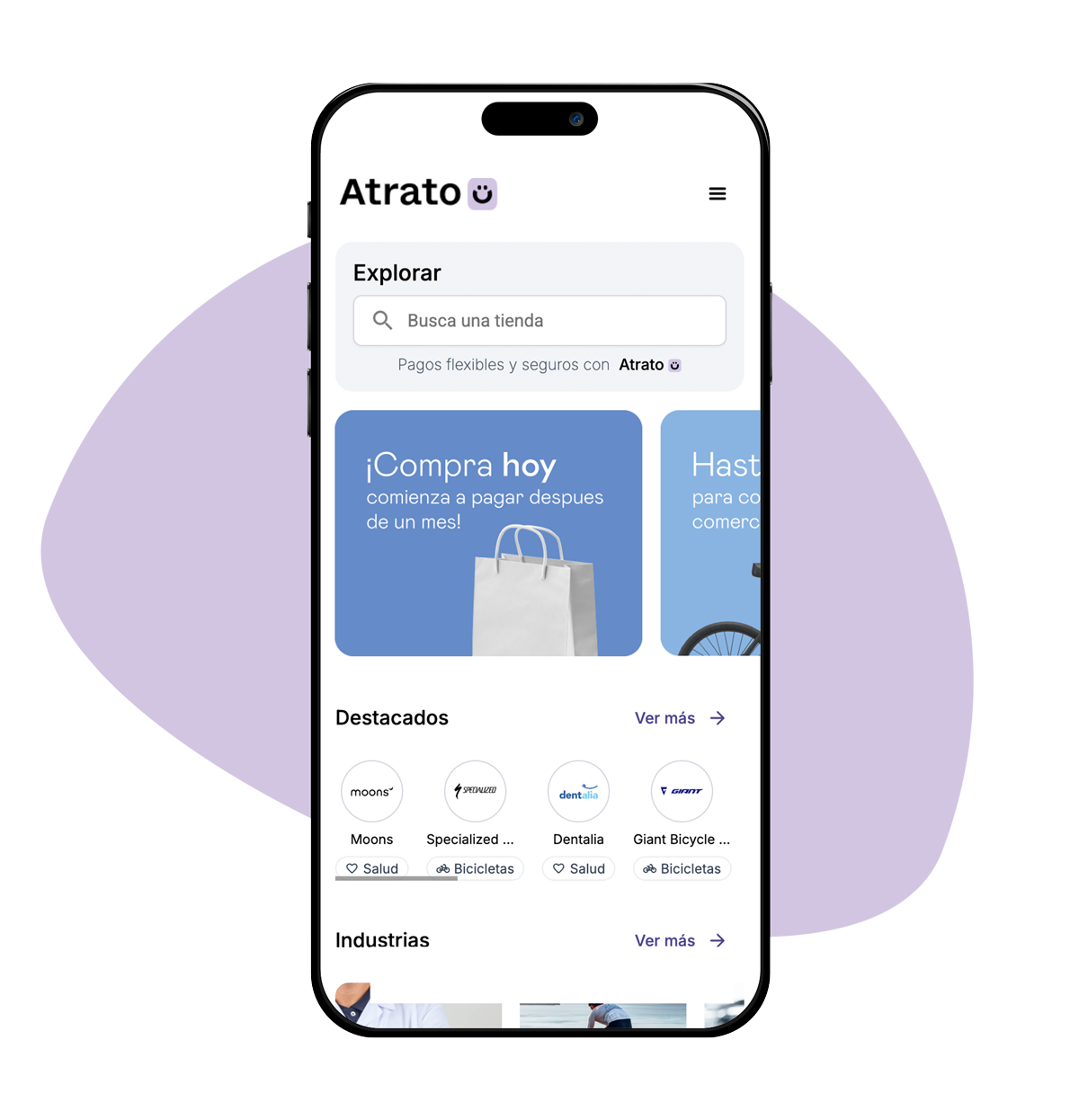 Elige Atrato como método de pago en el negocio afiliado de tu preferencia. Solicita tu crédito en menos de 10 minutos y elige tu plan de pagos ideal